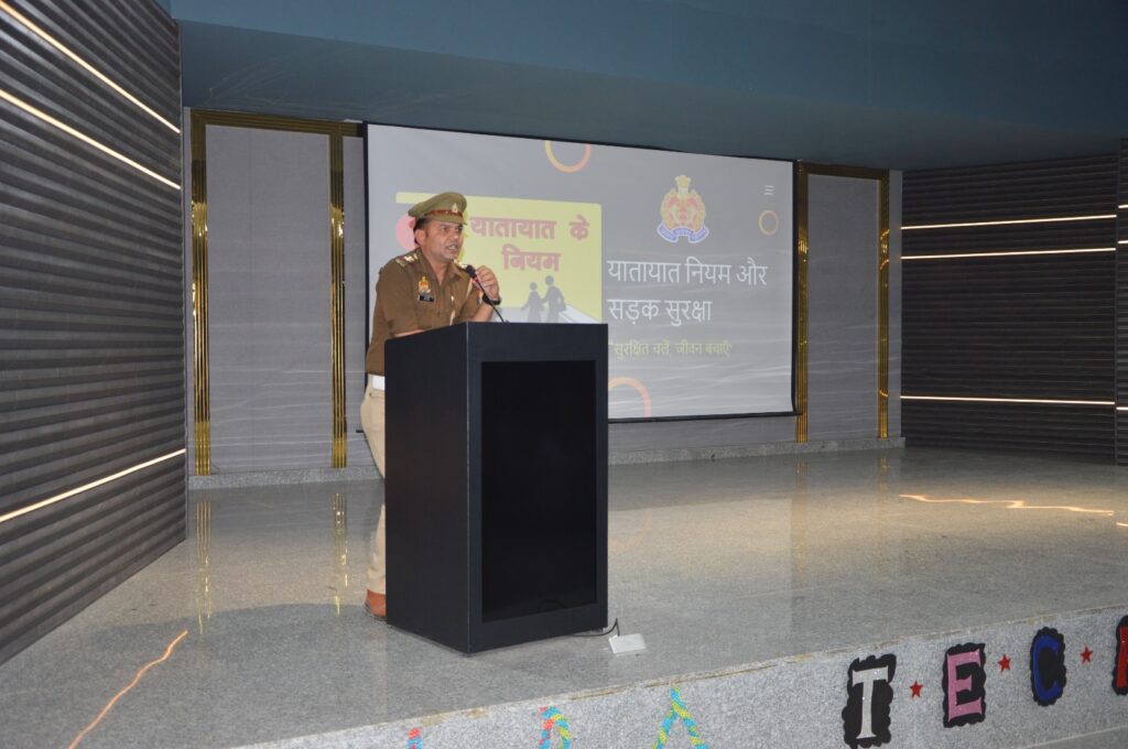 Ghaziabad news ट्रैफिक डीसीपी त्रिगुण बिसेन और एडिशनल ट्रैफिक डीसीपी सच्चिदानंद ने यातायात माह के तहत सोमवार को आईपीएम कॉलेज में छात्रों को पीपीटी और वीडियो के माध्यम से यातायात नियमों और सड़क सुरक्षा की जानकारी दी और ट्रैफिक नियमों का पालन करने के लिए प्रेरित किया गया।