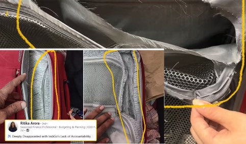 उन्होंने पोस्ट में @Ministry of Civil Aviation, @DGCA India, @Delhi International Airport, @Mumbai Airport, @AirSewa और @IndiGo6E को टैग किया। अरोड़ा ने सवाल उठाया, “आप कैसे उम्मीद कर सकते हैं कि कट बाहर से दिखेगा, जब सूटकेस को जिप लाइनिंग के नीचे काटा गया?”