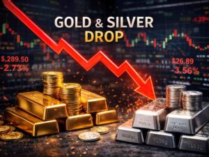 Gold and silver prices hit a historic low: कमोडिटी मार्केट में भारी उथल-पुथल देखने को मिली है। मल्टी कमोडिटी एक्सचेंज (MCX) पर चांदी की कीमतों में एक दिन में करीब 27% की भारी गिरावट दर्ज की गई, जो इतिहास की सबसे बड़ी इंट्राडे गिरावटों में से एक है। चांदी ₹4 लाख प्रति किलो के रिकॉर्ड हाई से फिसलकर ₹2.91 लाख से ₹3 लाख के स्तर पर आ गई। सोने की कीमतें भी रिकॉर्ड ऊंचाई से 10-11% नीचे आ गई हैं।