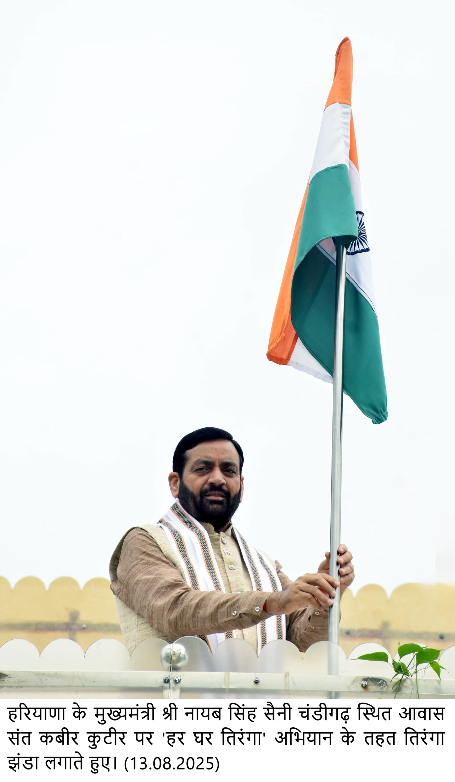 Haryana News: हरियाणा के मुख्यमंत्री श्री नायब सिंह सैनी ने आज संत कबीर कुटीर में हर घर तिरंगा अभियान के अंतर्गत तिरंगा लगाया। इस अवसर पर उन्होंने कहा कि हमारा राष्ट्रीय ध्वज हमारी आन, बान और शान का प्रतीक है, जो हमें राष्ट्र की अखंडता, बलिदान और गौरवपूर्ण इतिहास की याद दिलाता है।