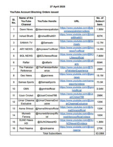 बैन किए गए प्लेटफॉर्म में समाचार आउटलेट डॉन, समा टीवी, एआरवाई न्यूज, बोल न्यूज, रफ्तार, जियो न्यूज और सुनो न्यूज के यूट्यूब चैनल शामिल हैं। पत्रकार इरशाद भट्टी, अस्मा शिराजी, उमर चीमा और मुनीब फारूक के यूट्यूब चैनल भी प्रतिबंधित किए गए हैं। प्रतिबंधित किए गए अन्य हैंडल में द पाकिस्तान रेफरेंस, समा स्पोर्ट्स, उजैर क्रिकेट और रजी नामा शामिल हैं। ऐसा इसलिए किया गया है ताकि पाकिस्तान अपने प्रोपेगंडा को भारत में ना फैला सके।