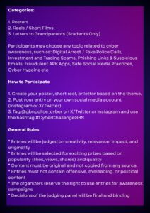 प्रतिभागी साइबर जागरूकता से संबंधित किसी भी विषय पर अपनी प्रविष्टि भेज सकते हैं, जैसे — डिजिटल अरेस्ट, फर्जी पुलिस कॉल, निवेश व ट्रेडिंग घोटाले, फ़िशिंग लिंक, संदिग्ध ईमेल, धोखाधड़ी वाले APK ऐप्स, सोशल मीडिया का सुरक्षित उपयोग, साइबर स्वच्छता आदि।*